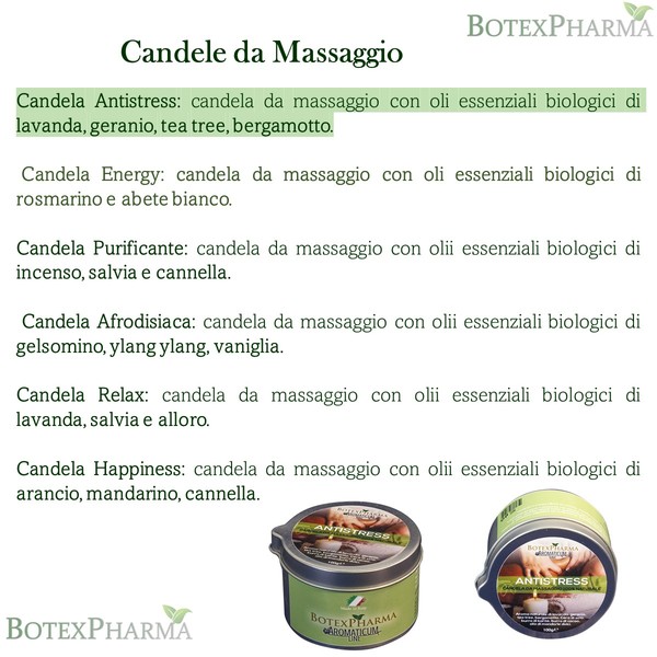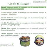- Benefits: 100% vegetable wax, made from soybean oil. Massage candle with organic essential oils of lavender, geranium, tea tree, bergamot.