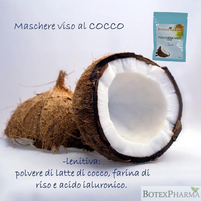 Coconut Mask, creates a moisturizing and emollient action leaving the skin soft and hydrated. Suitable for all skin types. Coconut milk powder contains a high percentage of Hyaluluronic acid with strong and soothing properties. It is often used for dry or stressed skin. Coconut milk powder mixed with hyaluronic acid nourishes deply, avoiding dehydration and soothing inflammation. This mask can also be used on sensible and young skin because it is not aggressive and does not have a high abrasive power. To be used with Botexpharma face tonic and cremes.
