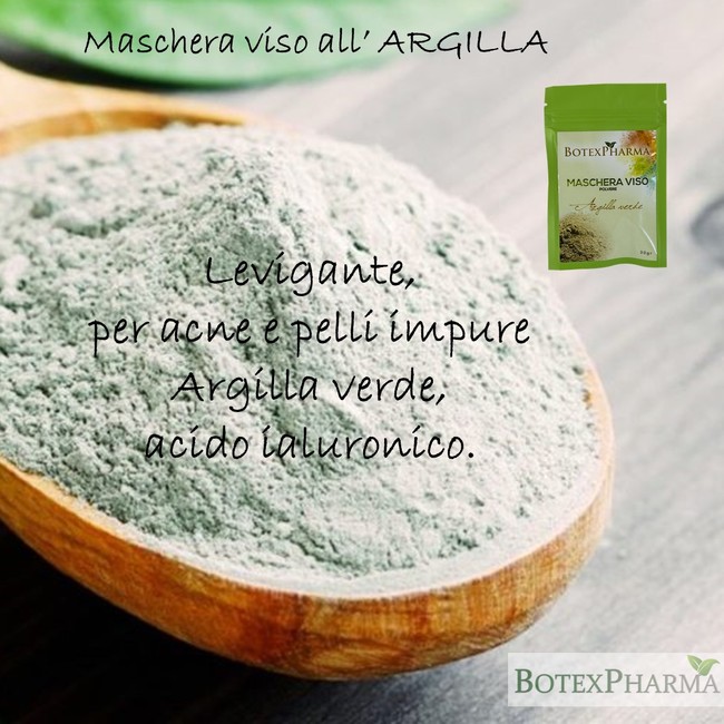 La maschera, grazie ai suoi ingredienti, produce un’azione detossinante e illuminante lasciando la pelle morbida. Adatta a tutti i tipi di pelle in particolare per quelle acneidi. L’argilla, dal potere assorbente e remineralizzante, ha proprietà antiossidanti perchè è in grado di legarsi ai radicali liberi responsabili dell’invecchiamento cutaneo e svolge un’azione cicatrizzante e disinfettante favorendo la rigenerazione della pelle. Un ingrediente fondamentale per la bellezza del viso in grado di eliminare le tossine presenti. L’argilla verde ha un alto potere assorbente, utile nel trattamento delle pelli grasse, miste e impure. La maschera, indicata anche contro scottature ed eritemi causati dal sole, arricchita dall’acido ialuronico è un elisir di qualità che dona alla pelle un aspetto nutrito e vellutato. Da utilizzare con il tonico e la crema idratante viso Botexpharma.