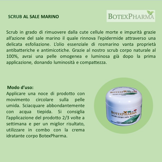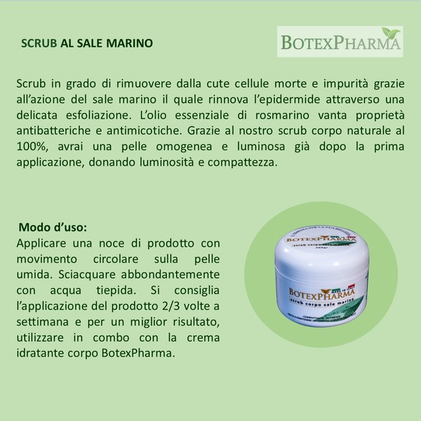 Scrub Corpo al Sale marino 15 gr, rimuove le cellule morte rinnovando l’epidermide.