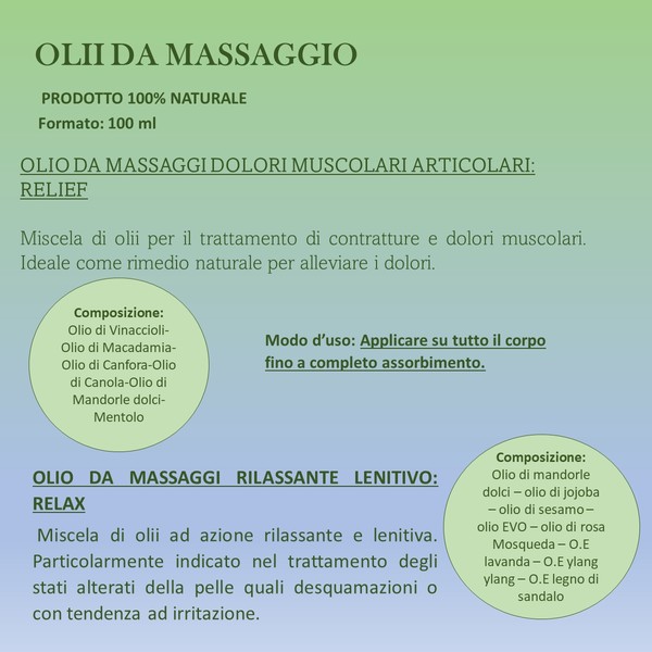 - Proprietà: Miscela di olii per il trattamento di contratture e dolori muscolari.