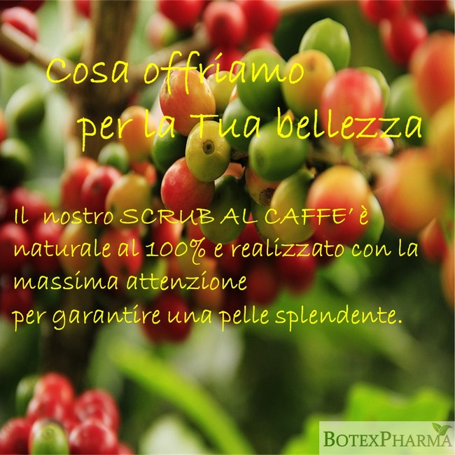 Scrub per la profonda pulizia della pelle. Svolge un’ottima azione esfoliante senza essere aggressivo. Eccessiva esposizione al sole, stress e inquinamento, possono rendere la tua pelle spenta e secca. Grazie al nostro scrub corpo naturale al 100%, avrai una pelle omogenea e luminosa già dopo la prima applicazione, donando luminosità e compattezza. Ad azione esfoliante da utilizzare tutto l’anno, diventa un alleato di bellezza indispensabile dopo l'esposizione al sole. L’esfoliazione è utile per avere una pelle più omogenea e per restituire luminosità senza essere invasiva. La caffeina ha infatti proprietà antiossidanti e tonificanti. Tra i principali ingredienti, oltre alla polvere di caffè troviamo l’olio extra vergine di oliva e l’acqua di Hamamelis. Utilizzare in combo con la crema idratante corpo Botexpharma.