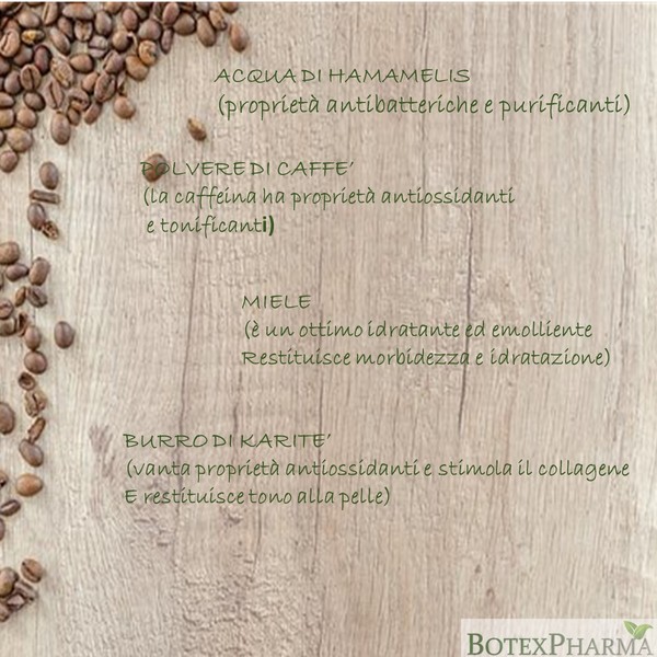 - Componenti: Acqua di Hamamelis, olio extra vergine di oliva, polvere di caffè, miele, burro di karité, olio di rosa